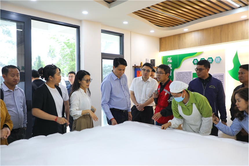 ▲考察團在凌云縣桑蠶產(chǎn)業(yè)幫扶項目現(xiàn)場參觀蠶絲被
