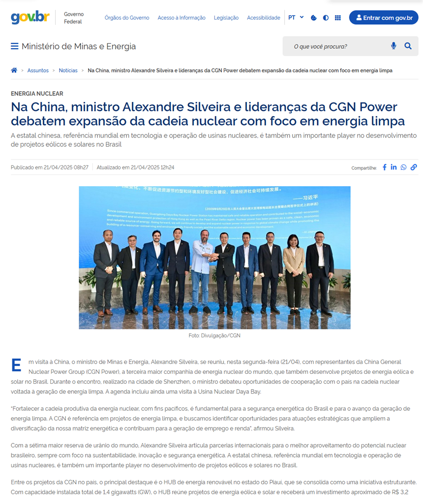 4月21日,集團(tuán)公司總經(jīng)理高立剛在大亞灣核電基地會見了來訪的巴西礦業(yè)與能源部(簡稱“巴西礦能部”)部長亞歷山大·西爾韋拉(Alexandre Silveira)一行,雙方就深化巴西清潔能源合作進(jìn)行了深入交流。能源國際副總裁石玲、巴西公司董事長姚志剛參加了交流。